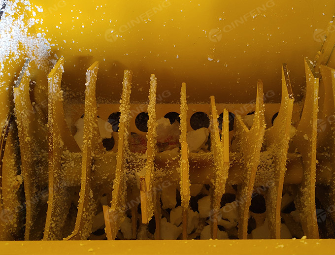傾斜投料斗一便于投 EPS 物料,二物料不會在破碎過程中將物料推出料斗。發泡聚苯乙烯的熱熔回收 機用破碎刀,平行放置的刀軸,刀軸上對稱地固定有刀片,刀軸上的刀片相互錯位排列,并且每根 刀軸上的相鄰刀片以相同方向錯開一定角度排列于刀軸上。物料破碎后用電機帶螺桿壓出成塊。